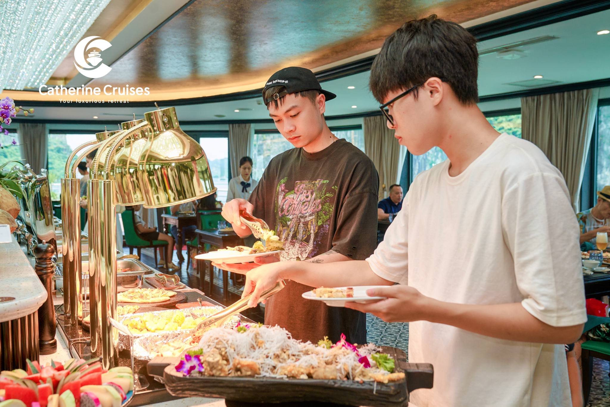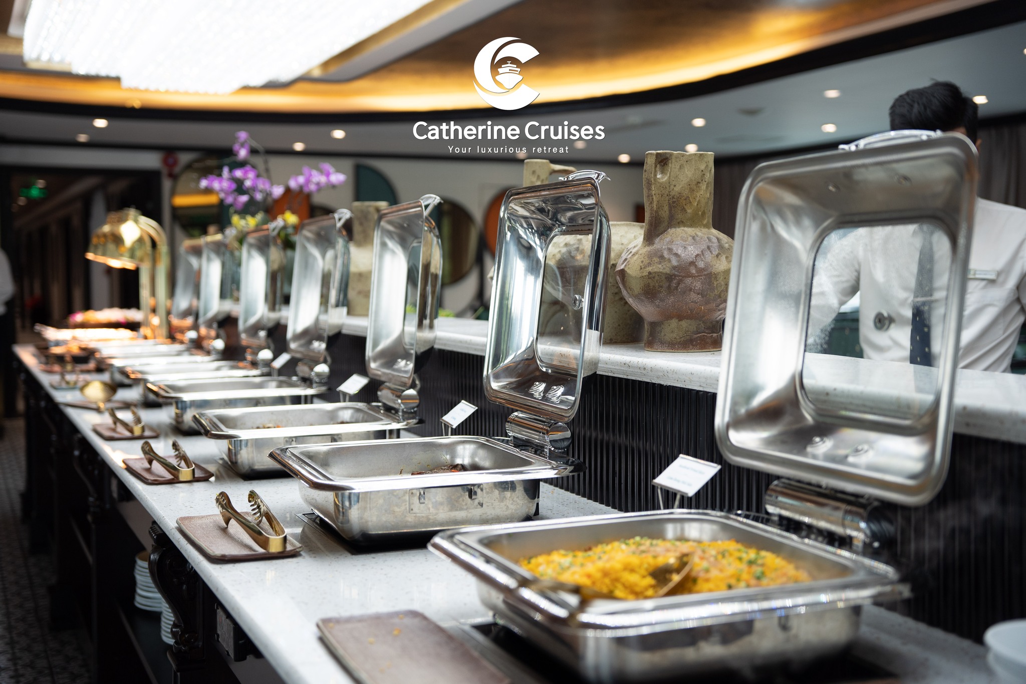 | 12:30 | Thưởng thức bữa trưa tại nhà hàng sang trọng với các món ăn hấp dẫn do đầu bếp chuyên nghiệp của Catherine chuẩn bị, trong khi tàu di chuyển ngắm cảnh Vịnh Hạ Long – Di sản thiên nhiên thế giới. |